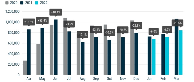 V marci 2022 registrácia osobných áut v Európskej únii naďalej klesala (-20,5 %). Predalo sa 844 187 kusov áut. Pokračujúce prerušenia dodávateľského reťazca sa ešte viac prehĺbia aj kvôli ruskej invázie na Ukrajinu, ktorá negatívne ovplyvnila výrobu áut. V dôsledku toho väčšina krajín v regióne zaznamenala dvojciferný pokles tržieb vrátane štyroch kľúčových trhov: Španielsko (-30,2 %), Taliansko (-29,7 %), Francúzsko (-19,5 %) a Nemecko (-17,5 %).