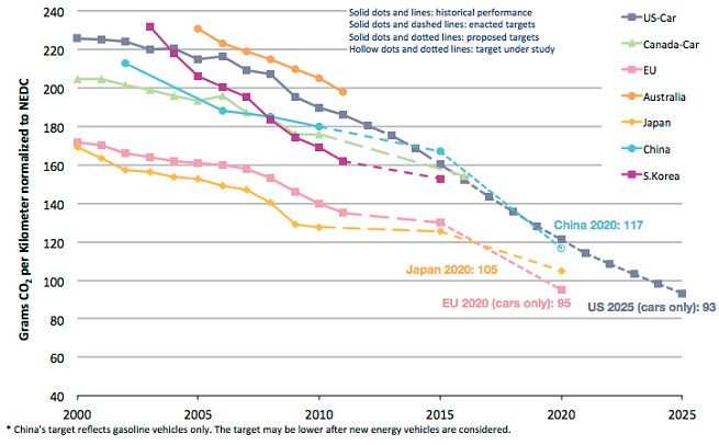 - Čína - v roce 2009 byl představen program Phase III, který do roku 2015 stanovil pro nové osobní automobily limitní spotřebu do 7 l / 100 km, což přibližně odpovídá 167 g CO2 / 1 km