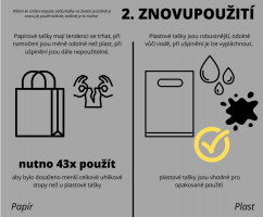 Papírové tašky mají tendenci se trhat, při namočení jsou méně odolné než plast, při ušpinění jsou dále nepoužitelné. Proto je nutno je použít 43x, aby bylo dosaženo menší celkové uhlíkové stopy než u plastových tašek. Plastové tašky jsou robustnější, odolné vůči vodě, při ušpinění je lze vypláchnout. Klíčem ke snížení dopadu sáčku/tašky na životní prostředí je znovu jej použít tolikrát, kolikrát je to možné.