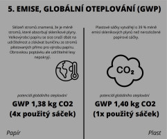 Sklizeň stromů znamená, že je méně stromů, které absorbují skleníkové plyny. Velkovýrobci papíru se sice snaží dbát na udržitelnost a získávat buničinu ze stromů pěstovaných přímo pro výrobu papíru. Obrovskou poptávku ale udržitelné lesy nepokryjí. Plastové sáčky vytvářejí o 39 % méně emisí skleníkových plynů než nerozložené papírové sáčky.
