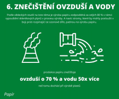 Podle vědeckých studií na toto téma je výroba papíru zodpovědná za celých 80 % v rámci vypouštění skleníkových plynů v procesu výroby. A navíc stromy, které by mohly posloužit v boji proti rozpínající se ozonové díře, padnou na výrobu papíru. Produkce papíru znečišťuje ovzduší o 70% a vodu 50x více než tomu dochází při výrobě plastů.
