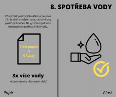 Při výrobě papírových sáčků se používá třikrát větší množství vody, než u výroby plastových sáčků. Na vytvoření jednoho listu papíru je potřeba 5 litrů vody, což je 3x více než pro výrobu plastových sáčků.