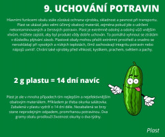 Plast je ale v mnoha případech tím nejlepším a nejefektivnějším obalovým materiálem. Příkladem je třeba okurka salátovka. Zabalená v plastu vydrží o 14 dní déle. Nezabalená se brzy stane neprodejným odpadem, promrhanou potravinou. Dva gramy obalu prodlouží životnost okurky o dva týdny.