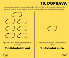 Pro transport stejného množství papírových tašek je třeba 7x víc kamionů, než pro tašky plastové, přičemž se vyprodukuje 7-krát víc oxidu uhličitého a spotřebuje 7-krát víc paliva. K přepravě dvou milionů papírových sáčků je potřeba 7 nákladních aut, zatímco u plastových sáčků postačí 1 nákladní auto.