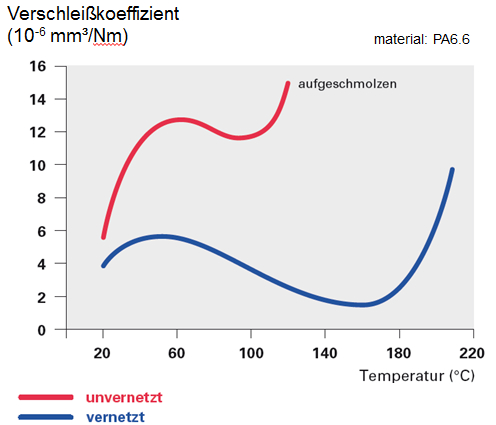 Obr. 1: Oblast použití nezesíťovaného PA 6.6 pod tribologickým zatížením je 20 °C. Radiační síťování zabraňuje tání polymeru a zvyšuje teplotu trvalého použití až o 100 °C a zároveň redukuje koeficientem opotřebení. Díky vyššímu teplotnímu rozsah použitelnosti dosahuje míra opotřebení svého minima teprve při cca 170 °C. Zdroj: BGS |