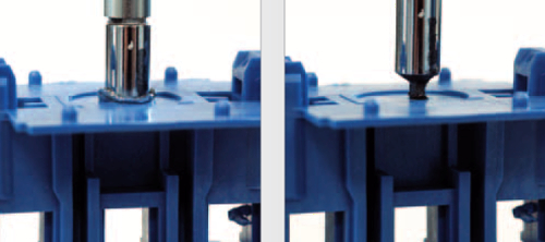Obr. 2: Ověření teplotní odolnosti a tvarové stálosti za tepla zesíťovaných součástek měřením hloubky vniku při testu horkým hrotem (vlevo: nezesíťovaný materiál, vpravo: zesíťovaný materiál PA-6 GF30, zatížení: 1 000 g, teplota: 350 °C). Zdroj: BGS |